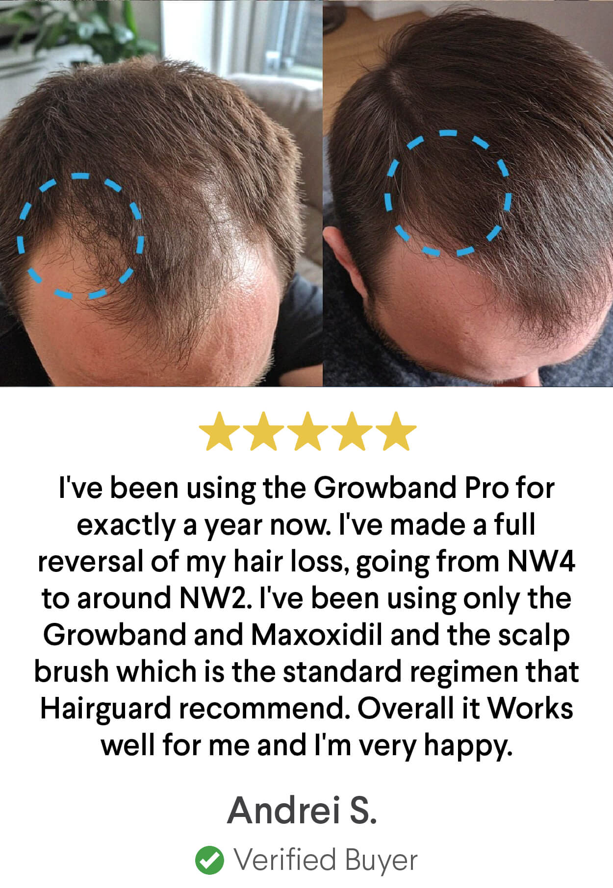 Restore natural hair growth with the Growband Pro in as little as 3 months. The world's first, fully automated scalp massager designed to reverse male pattern hair loss without side effects.